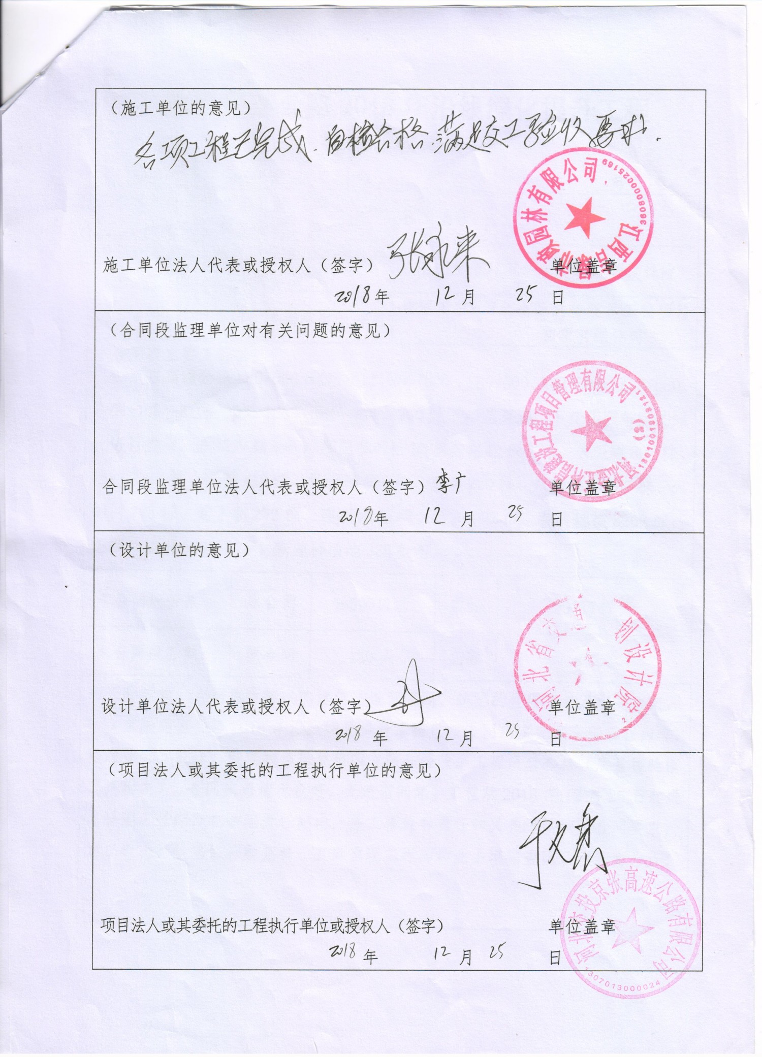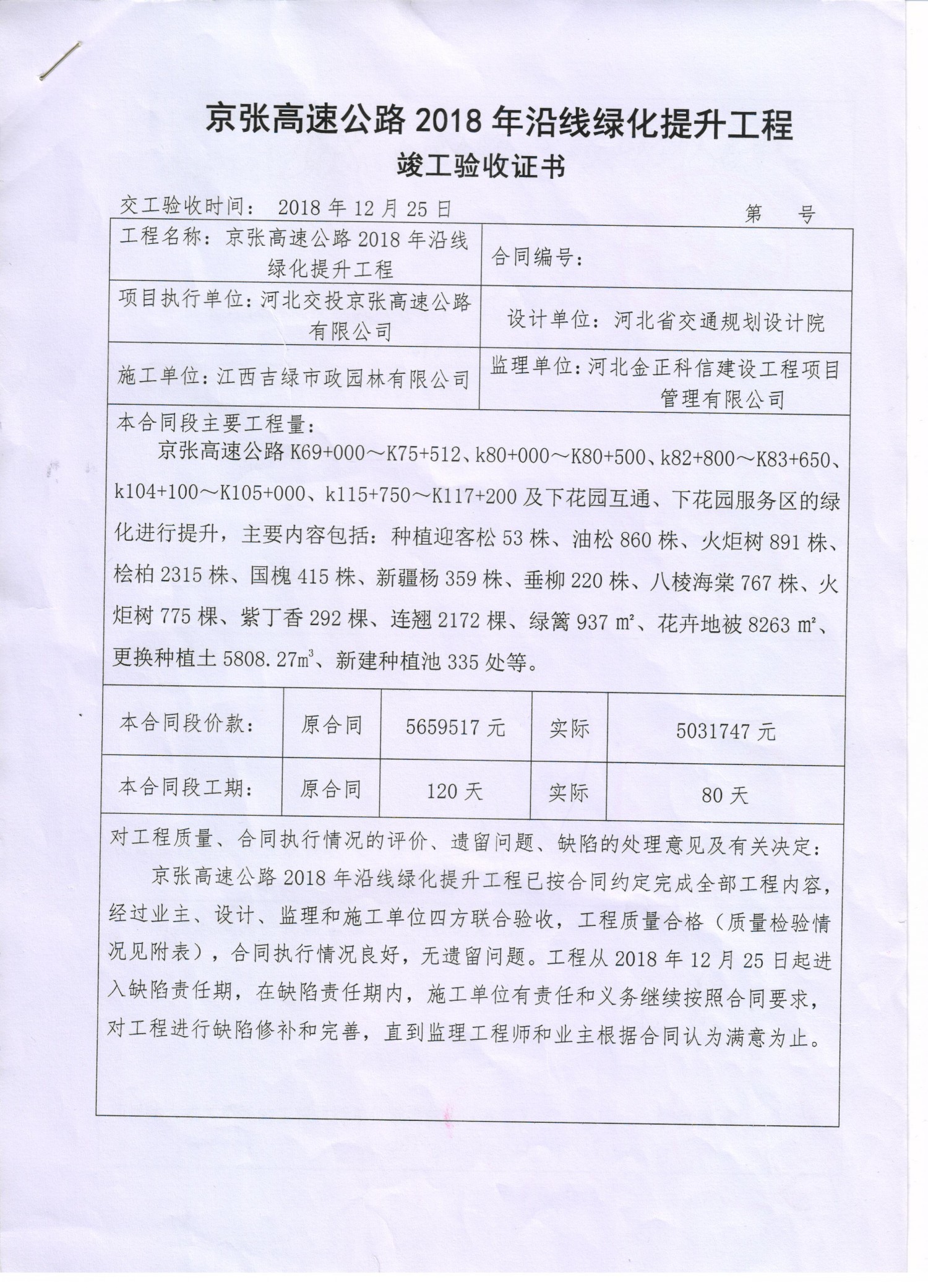 京張高速公路2018年沿線綠化提升工程竣工驗收證書