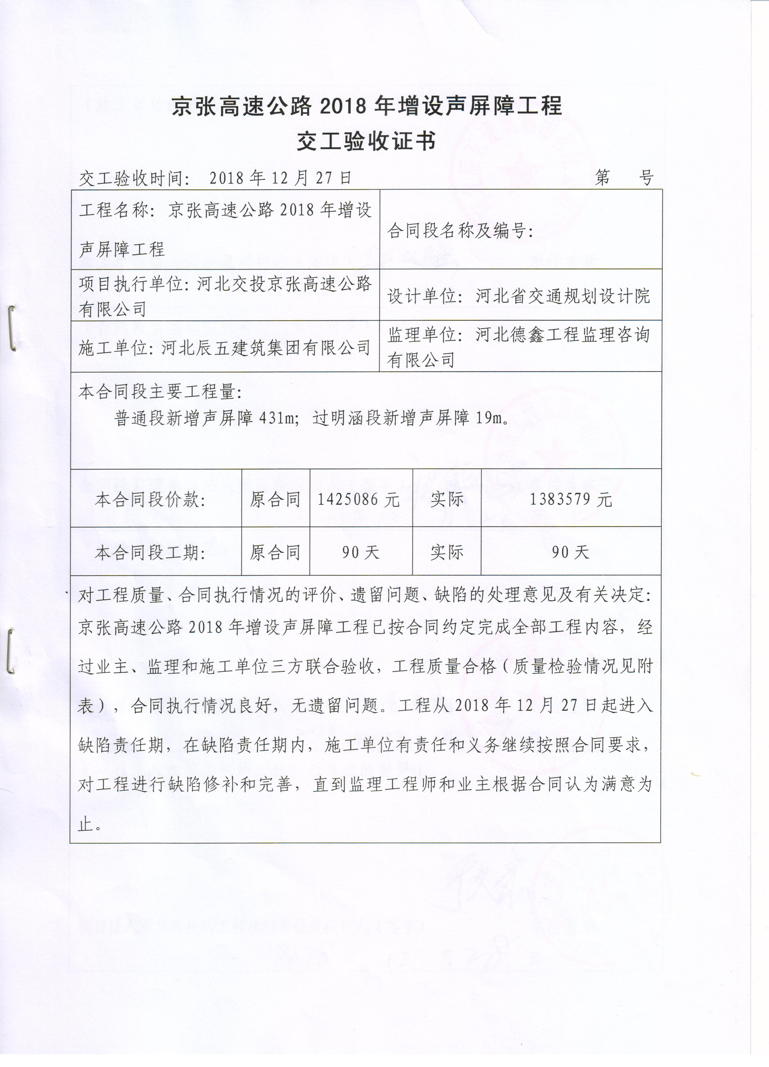 京張高速公路2018年增設(shè)聲屏障工程交工驗(yàn)收證書